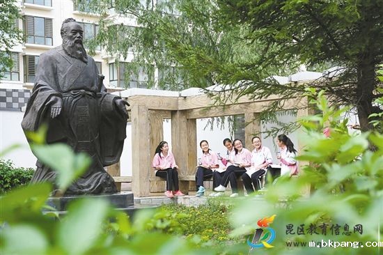 包钢三中崇尚 "礼乐教育" ,在学校的桃李园中尊立孔子像,学生在不知不觉中接受文化陶冶